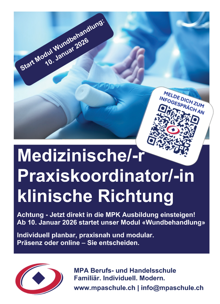 Unser neues Modul „Wundbehandlung“ startet ab 10. Januar 2026. Im Präsenzmodus und/oder Online.